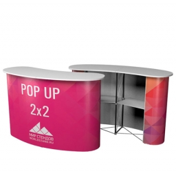 Стойка выполнена аналогично конструкции Pop Up, раскрывается по типу зонтика, сверху устанавливается столешница, а внутри прекрасно размещаются 2 удобные пластиковые полочки. Самым главным элементом в этой стойке является рекламное фотополотно, которое привлекает внимание посетителей к вашей компании.